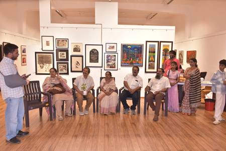 This show was inaugurated on 11th November 2025 by Honourable Guests Mr. Anant Nikam(Veteran print maker, artist and former HOD all department of Sir J.J. School of Arts), Mr. Gourmoni Das(Director & Founder of Nine Fish Gallery and Dot Line Space Foundation), Ms. Ranjitha S – Director & Founder of JMS Mani studio daughter of JMS Mani, Mr. Darshan Kumar YU – Curator(muesmuseologist), artist & Thinker, Sushma Sabnis – Art writer & curator among others.